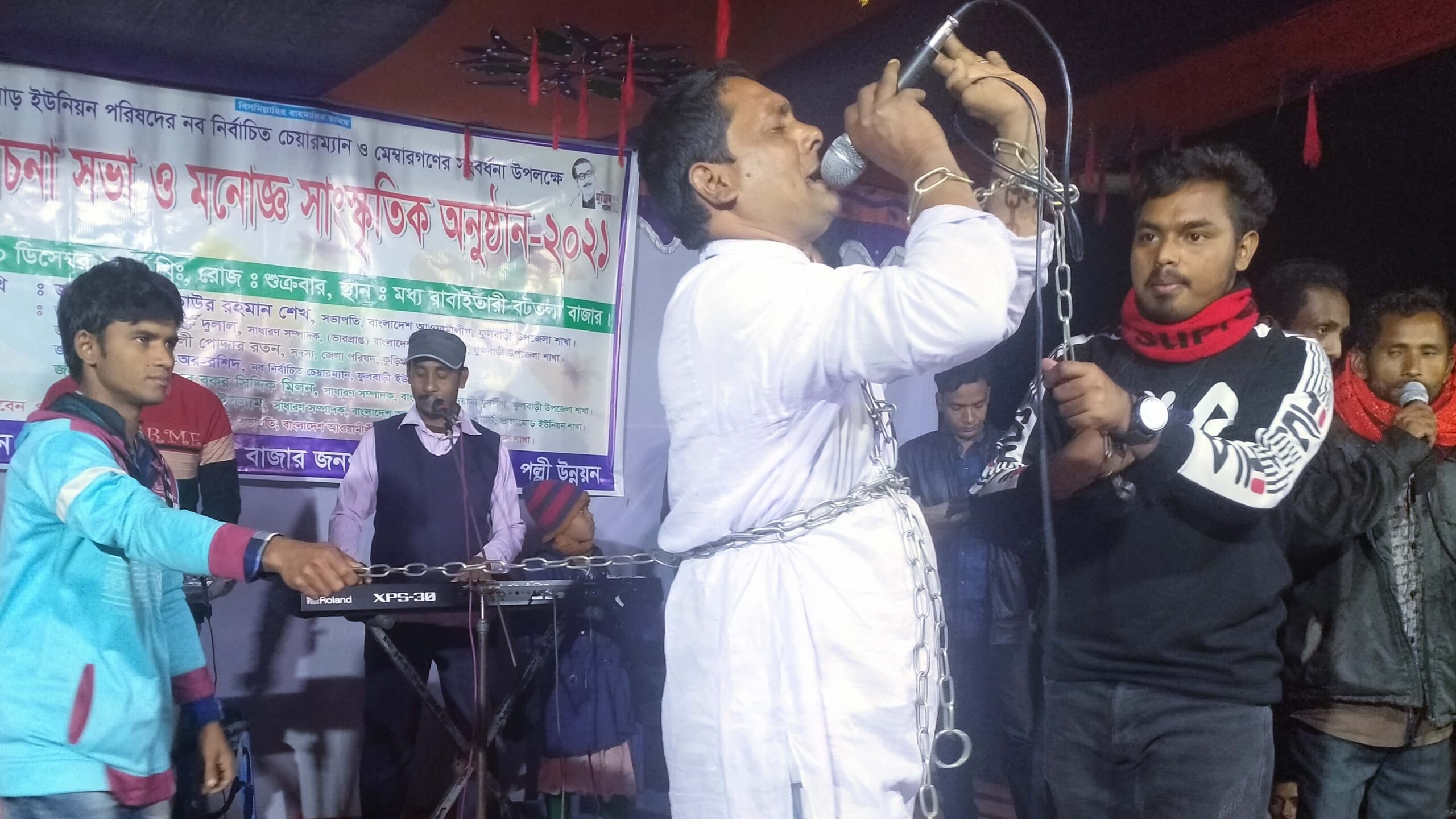 শুক্রবার (১০ ডিসেম্বর ২০২১) সন্ধ্যা সাড়ে সাতটায় উপজেলার ভাঙ্গামোড় ইউনিয়নের রাবাইতারী বটতলা বাজার জনশক্তি সমাজসেবা ও পল্লী উন্নয়ন সংস্থার আয়োজনে বটতলা বাজার সংলগ্ন মাঠে নবনির্বাচিত ইউপি চেয়ারম্যান ও সদস্যদের সংবর্ধনা, আলোচনা সভা ও মনোজ্ঞ সাংস্কৃতিক অনুষ্ঠান হয়। সেই অনুষ্ঠানে শাহজালাল লোহার শিকল পড়ে মঞ্চে উঠে তাক লাগিয়ে দেন সবাইকে। এই শিকল পরার কারণ তিনি মঞ্চে উঠেই দর্শকদের জানিয়ে দেন।