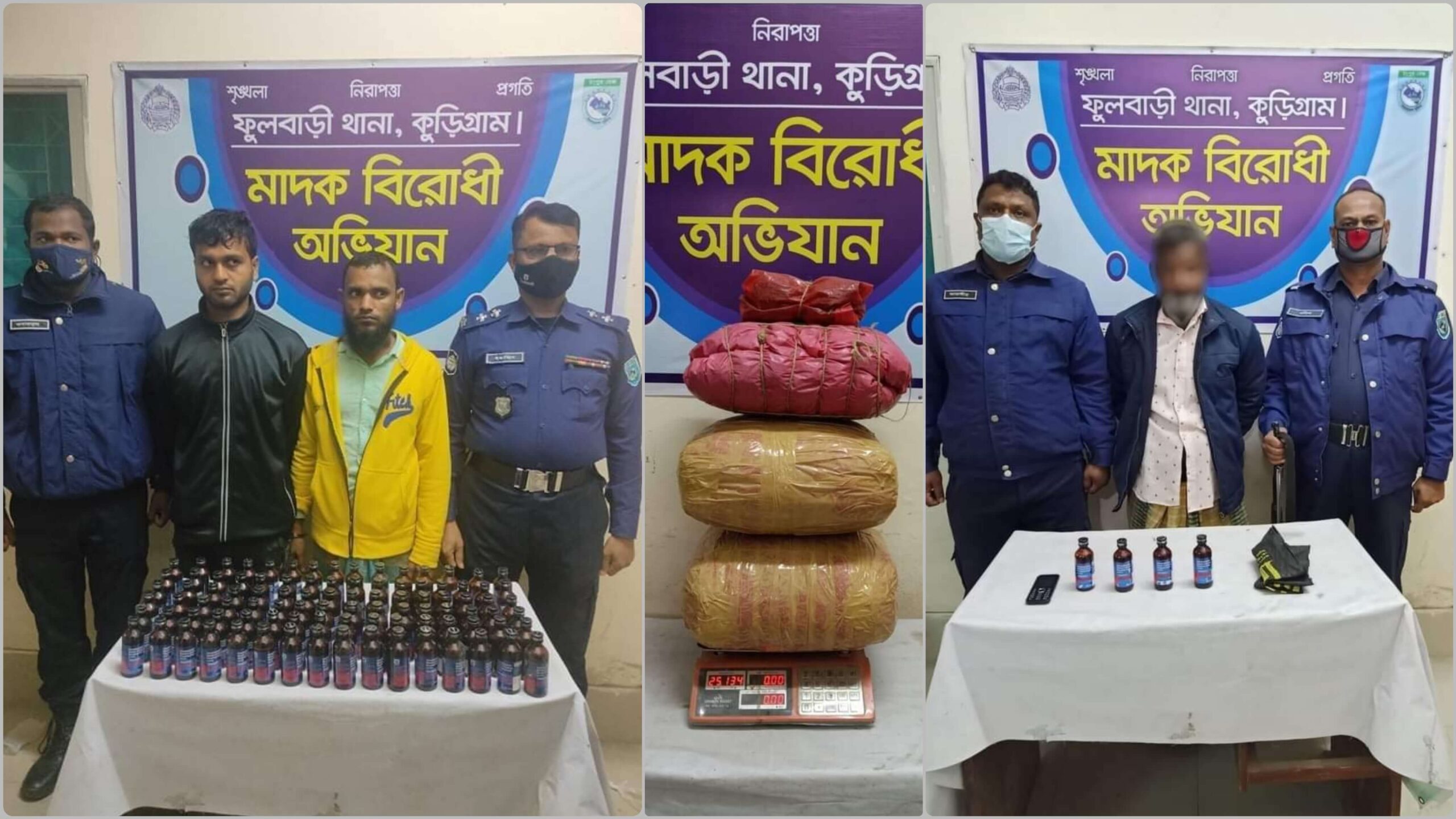 কুড়িগ্রামের ফুলবাড়ীতে চলমান মাদক বিরোধী অভিযানে গাঁজা ও ফেন্সিডিল উদ্ধার সহ তিনজন মাদক কারবারি কে আটক করেছে ফুলবাড়ী থানা পুলিশ। বৃহস্পতিবার দিবাগত রাতে পৃথক তিনটি স্থানে অভিযান চালিয়ে ২৫ কেজি গাঁজা ও ৯৯ বোতল ফেন্সিডিল উদ্ধার সহ তাদেরকে আটক করা হয়।