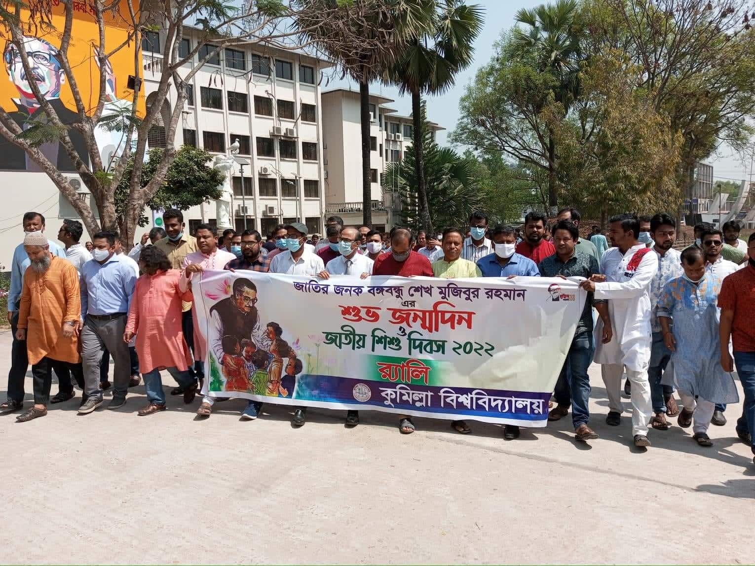 বৃহস্পতিবার (১৭ মার্চ) নানা আয়োজনের মধ্যে কুমিল্লা বিশ্ববিদ্যালয়ে পালিত হয়েছে বঙ্গবন্ধু শেখ মুজিবুর রহমানের জন্মদিবস ও জাতীয় শিশু দিবস। চিত্রাঙ্কন প্রতিযোগিতা, কেক কাটা, পুষ্পস্তবক অর্পণসহ বিভিন্ন কর্মসূচি পালন করে বিশ্ববিদ্যালয় প্রশাসন। দিবসটি উপলক্ষে এদিন সকাল ১০ টায় বিশ্ববিদ্যালয়ের ব্যাডমিন্টন কোর্টে শিশুদের চিত্রাঙ্কন প্রতিযোগিতার মধ্যে দিয়ে আনুষ্ঠানিকতা শুরু হয়। পরে বেলা ১১টায় বিশ্ববিদ্যালয়ের উপাচার্য অধ্যাপক ড. এ. এফ. এম আবদুল মঈনের নেতৃত্বে প্রশাসনিক ভবনের সামনে থেকে এক শোভাযাত্রা বের করা হয়। শোভাযাত্রাটি বিভিন্ন সড়ক প্রদক্ষিণ শেষে বঙ্গবন্ধু ভাস্কর্যের পাদদেশে এসে শেষ হয়। উপাচার্যের নেতৃত্বে বঙ্গবন্ধুর ভাষ্কর্যে পুষ্পার্ঘ্য অর্পণ করেন বিশ্ববিদ্যালয় পরিবারের সদস্যরা। এরপর শিক্ষক সমিতি, বঙ্গবন্ধু পরিষদ, বিভিন্ন হল, কর্মকর্তা-কর্মচারী, বিশ্ববিদ্যালয়ের শাখা ছাত্রলীগ বঙ্গবন্ধুর ভাষ্কর্যে পুষ্পার্ঘ্য অর্পণ করেন।