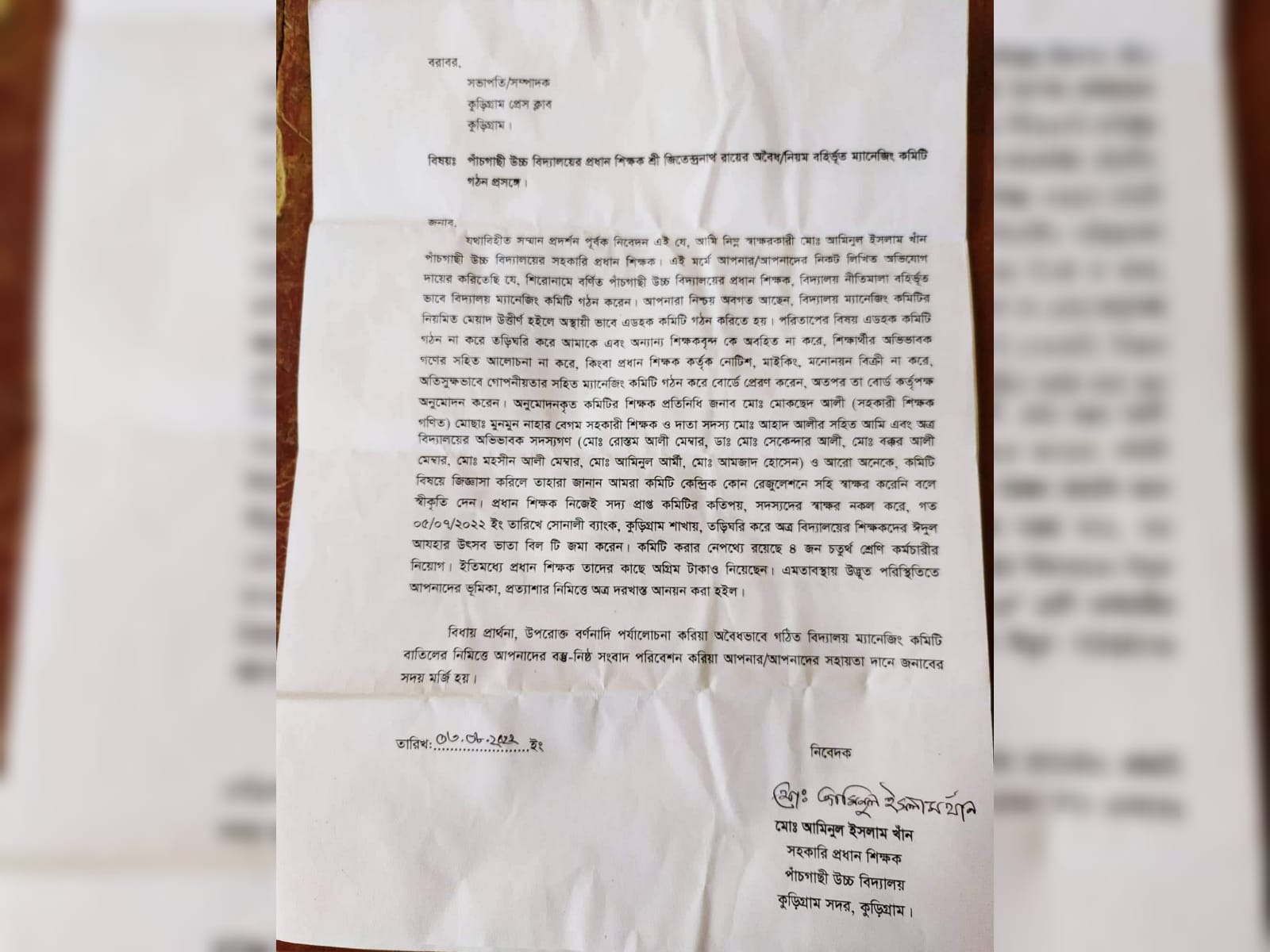 নিজস্ব প্রতিবেদক, কুড়িগ্রাম: কুড়িগ্রাম সদর উপজেলার পাঁচগাছী উচ্চ বিদ্যালয়ের প্রধান শিক্ষক শ্রী জিতেন্দ্র নাথ রায়ের বিরুদ্ধে অবৈধ/নিয়ম বহির্ভূত ম্যানেজিং কমিটি গঠনের অভিযোগ পাওয়া গেছে। এ অনিয়মের প্রতিকার চেয়ে জেলা শিক্ষা কর্মকর্তা ও উপজেলা নির্বাহী কর্মকর্তার (ইউএনও) কাছে লিখিত অভিযোগ করেছেন ওই স্কুলের সহকারী প্রধান শিক্ষক আমিনুল ইসলাম খান।