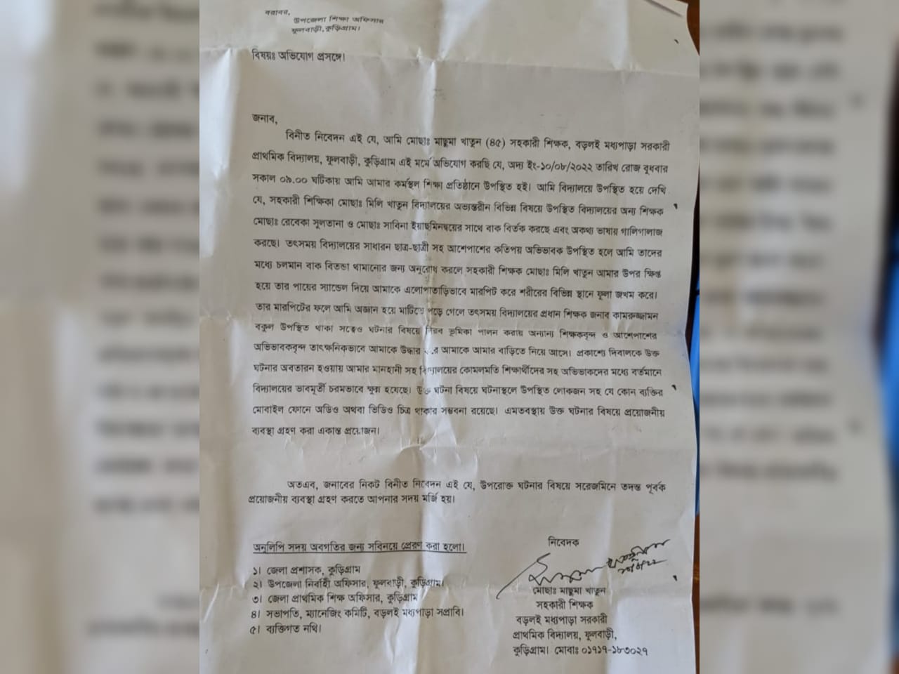 কুড়িগ্রামের ফুলবাড়ীতে এক সরকারি প্রাথমিক বিদ্যালয়ের সহকারী শিক্ষিকার বিরুদ্ধে অপর এক সহকারী শিক্ষিকাকে জুতাপেটা করে লাঞ্ছিত করার অভিযোগ পাওয়া গেছে। ঘটনাটি ঘটেছে গত বুধবার (১০ আগস্ট) উপজেলার বড়ভিটা ইউনিয়নের বড়লই মধ্যপাড়া সরকারি প্রাথমিক বিদ্যালয়ে। পরে ওই দিনই বিকেলে উপজেলা প্রাথমিক শিক্ষা কর্মকর্তা বরাবর একটি লিখিত অভিযোগ করেছেন ভুক্তভোগী শিক্ষিকা।