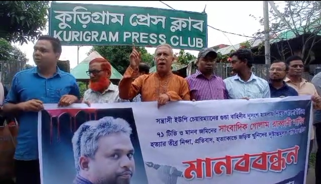 সন্ত্রাসী ইউপি চেয়ারম্যান মাহমুদুল আলম বাবুর গুন্ডা বাহিনীর নৃসংশ হামলায় নিহত বাংলা নিউজ, ৭১ টিভি ও মানব জমিনের সাংবাদিক গোলাম রব্বানী নাদিম। এ ঘটনার তীব্র নিন্দা, প্রতিবাদ ও হত্যাকান্ডে জড়িত খুনিদের দৃষ্টান্তমূলক শাস্তির দাবিতে কুড়িগ্রামে মানব বন্ধন অনুষ্ঠিত হয়েছে।