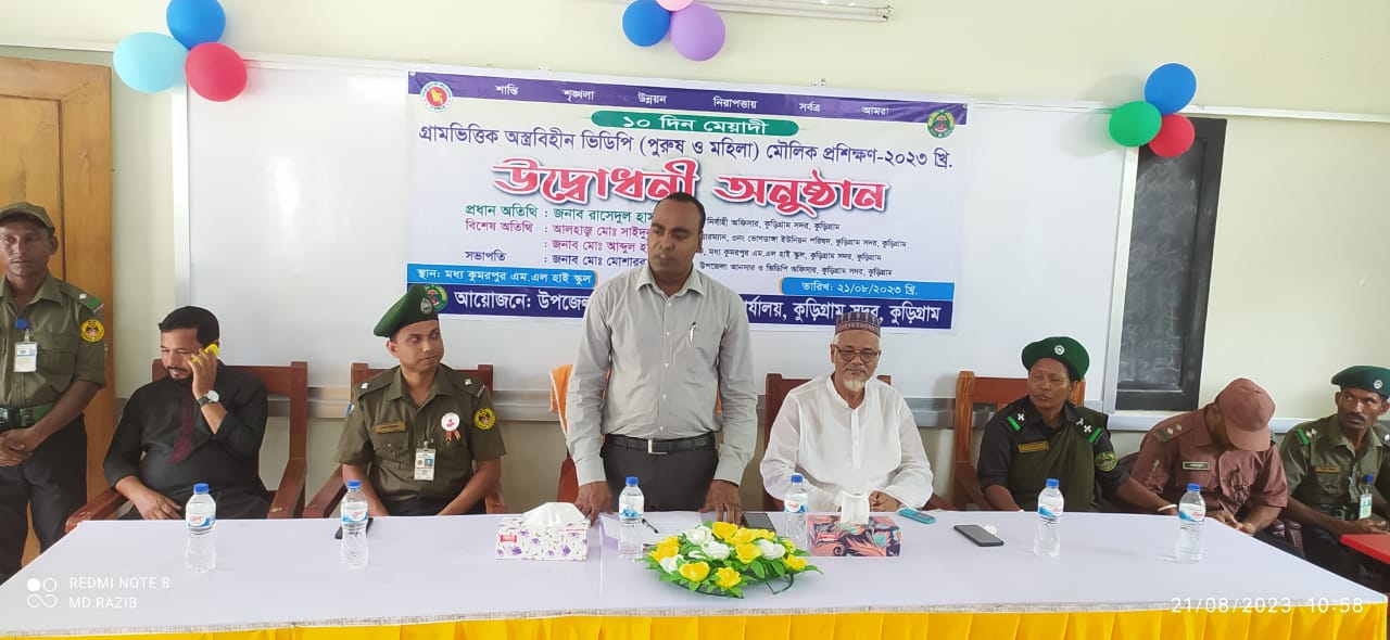 অনুষ্ঠানে সভাপত্বি করেন কুড়িগ্রাম সদরের উপজেলা আনসার ও ভিডিপি কর্মকর্তা মোঃ মোশাররফ হোসেন। উক্ত গ্রামের ৩২ জন পুুরুষ ও ৩২ জন নারীকে নিয়ে প্রশিক্ষণটি ২০ আগস্ট শুরু হয়েছিল। একই সঙ্গে কুড়িগ্রামের অন্যান্য উপজেলাতেও উক্ত প্রশিক্ষণ কার্যক্রম চলছে।
